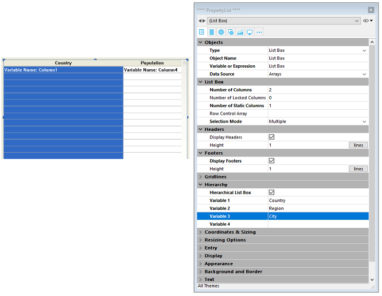 Additional options (Variable 1...10) are available when the Hierarchical List Box option is selected, corresponding to each element of the dataSource array to use as break column. Each time a value is entered in a field, a new row is added. Up to 10 variables can be specified. These variables set the hierarchical levels to be displayed in the first column.