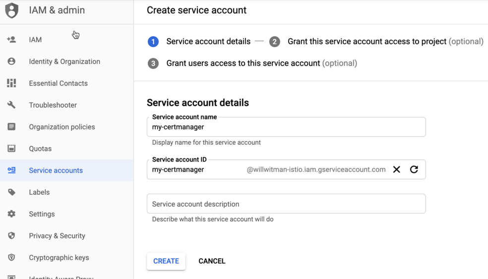 You can optionally add a description in the Service account description field. Descriptions are helpful at reminding you what a particular service account is used for.