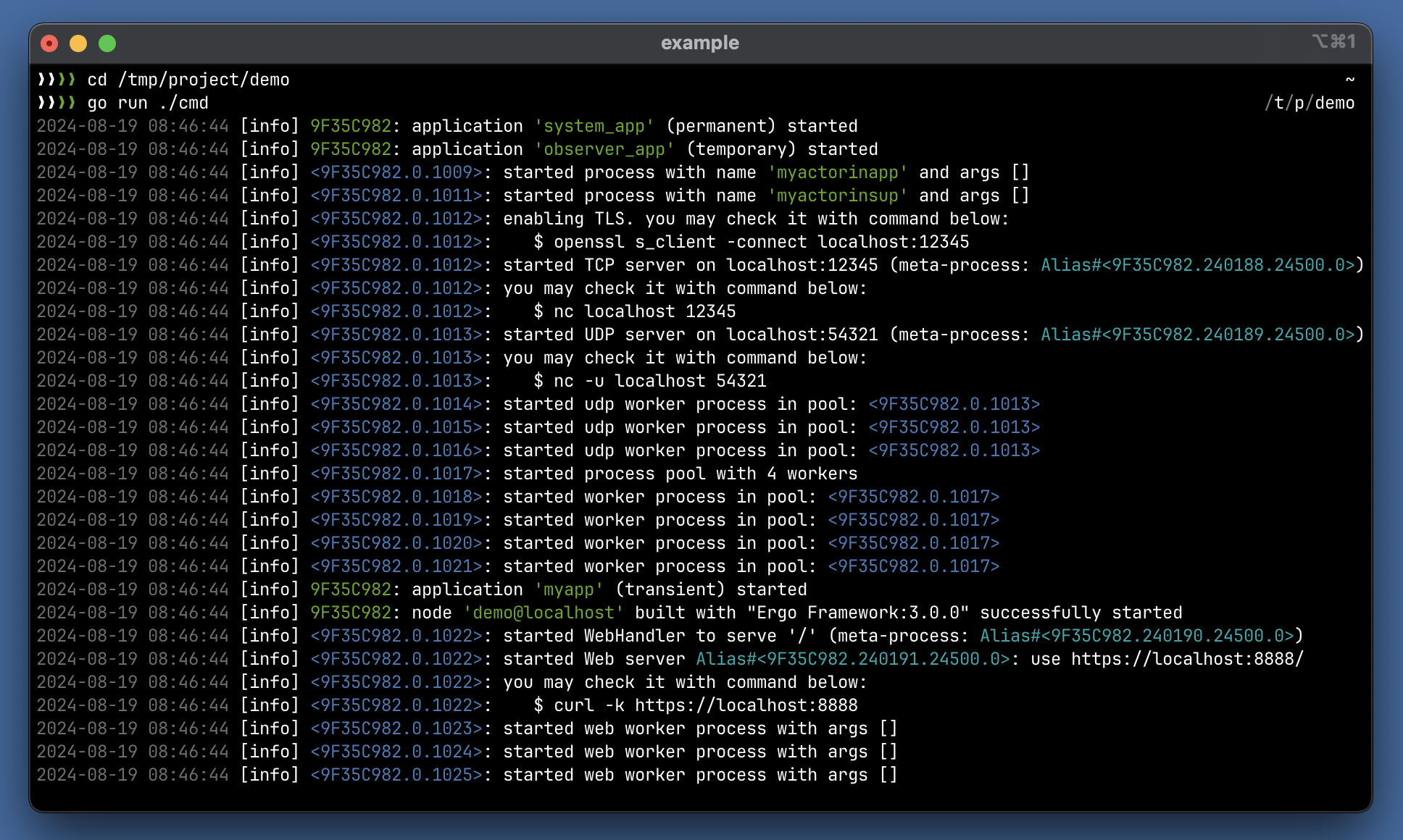Since this example includes the [observer application](https://docs.ergo.services/extra-library/applications/observer), you can open `http://localhost:9911` in your browser to access the web interface for [inspecting the node](https://docs.ergo.services/tools/observer) and its running processes.