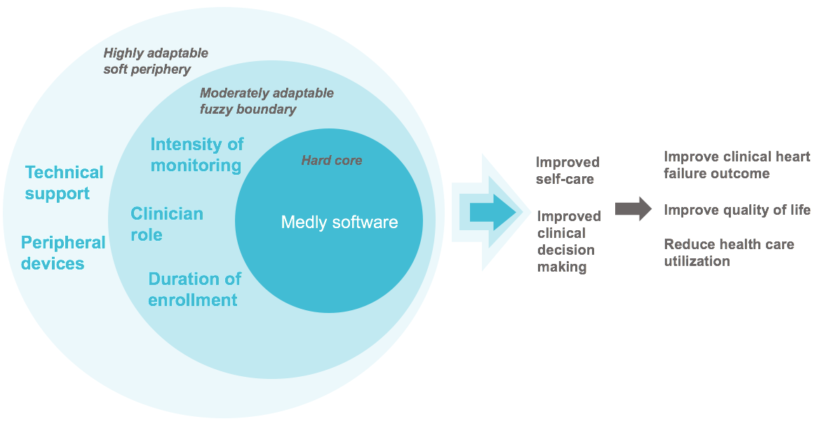 A useful analogy used by theorists to discuss the notion of adaptability is the idea that health interventions have a hard core and a soft periphery [-]. The hard core represents the essence of an intervention, in other words, the central mechanism(s) for producing desired health outcomes in the intervention’s theory of change []. When considering telemonitoring, the hard core can be conceptualized as an intervention that leverages technology to enable the collection and transmission of patient biometric data to be viewed and acted upon by a clinician at a distant location [].