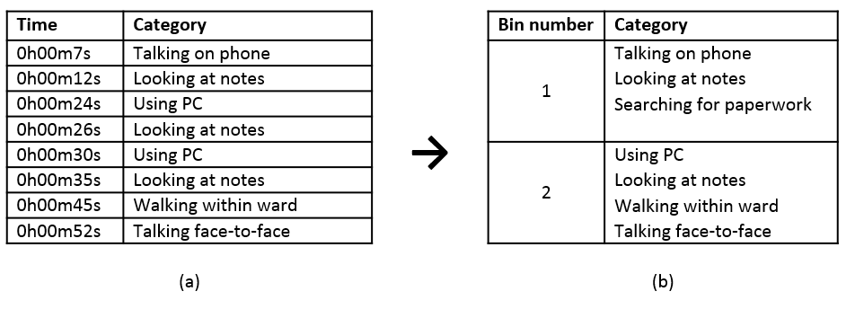 presents an illustration of how the use of eObs and handheld mobile devices has changed working tasks and locations for clinicians. This example uses a 1-hour exemplar and assumes that each observed activity spanned the entire 30-second observation bin.