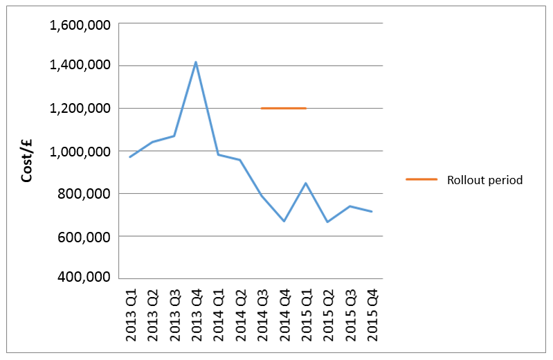 On the basis of nominal reference costs of £800 per Level 2 (HDU) bed day and £1200 per Level 3 (ICU) bed day, this 10% reduction in critical care admissions equates to an approximate £250K saving per quarter () since deployment.