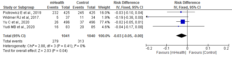 Regarding the rehospitalizations of patients during the study period in each RCT, the meta-analysis showed that rehospitalizations for both all causes (P=.04) and cardiovascular causes (P=.05) were statistically higher in the control group than in the mHealth group. These studies were homogeneous (I2=0%; [,,,] and [,,,,,]).