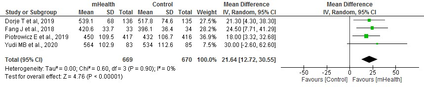 A total of 17% (4/23) of homogeneous studies (I2=0%) analyzed exercise capacity by means of the 6-minute walk test (6-MWT) with a sample of 1339 patients. The results of the meta-analysis showed that exercise capacity as measured by this test was significantly higher in the mHealth groups (P<.001; [,,,]).