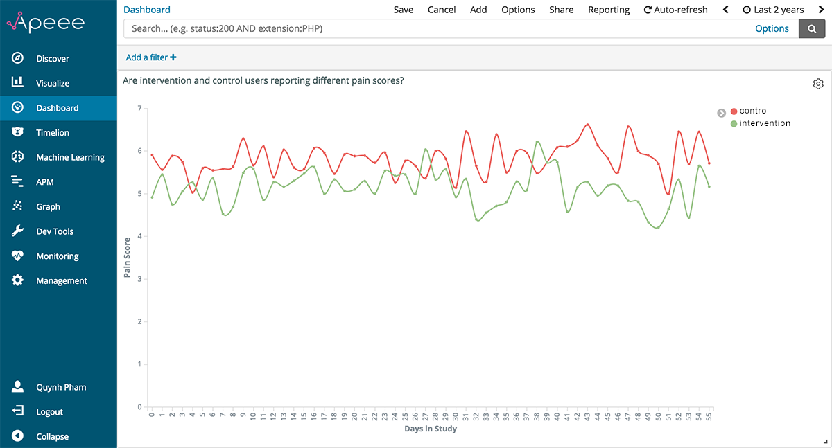 Equipped with the ability to create relative time visualizations, we endeavored to trial a final visualization before concluding our development cycle: a line graph of pain-related outcome scores reported by users over time elapsed in the study. An advantage to iCanCope was the in-app collection of clinical outcomes through the check-in feature. These data were stored on our servers as Fast Healthcare Interoperability Resources (FHIR), which is a data format that cannot be visualized on APEEE. We resolved this interoperability issue by transforming the FHIR data into log data through parsing out the outcome scores, injecting related user-level metadata, and then ingesting these data into Elasticsearch using Logstash. Once ingested, we applied the same Elasticsearch framework and aggregations for querying check-in data over time elapsed in the study.