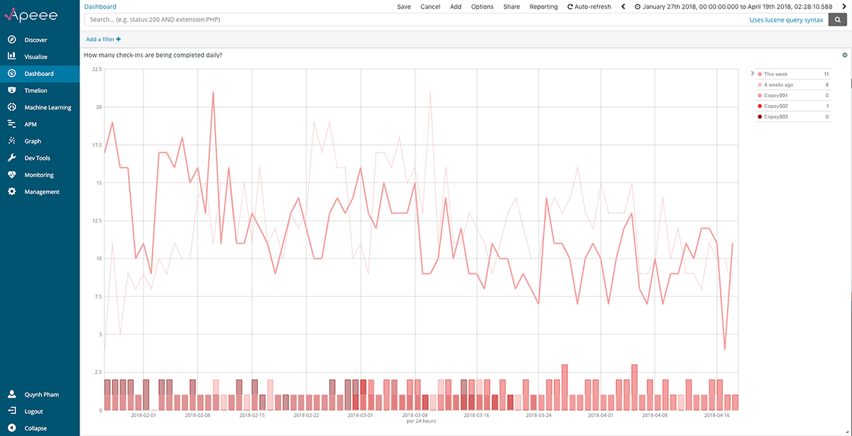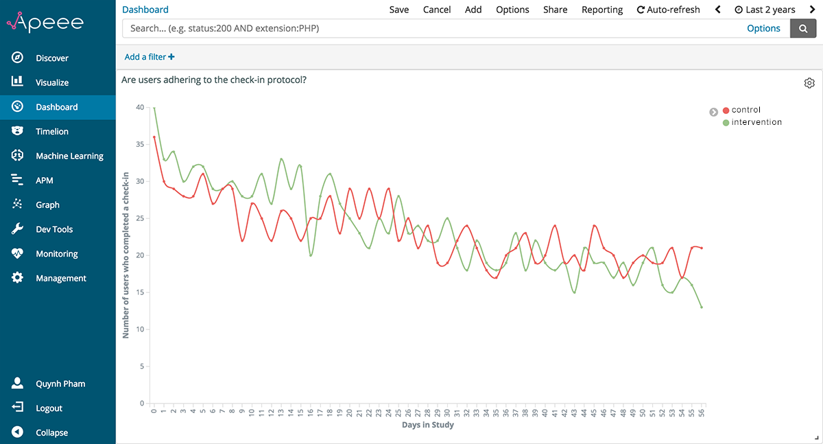The requirement for APEEE to support visualizations of events over relative time was of high priority for us to build out. We recognized the significant value that this functionality would add to APEEE, specifically in a research context where events are typically analyzed as a function of time elapsed in a study. To address this requirement, we sought to modify our existing analytic indicator for “how many check-ins are being completed daily” to have the x-axis represent time elapsed in the study. Visualizing check-in completion over time elapsed in the study supports determining effective engagement with iCanCope because the behavior of checking into the app and reporting symptoms is theorized to mediate improved pain-related outcomes []. We initiated work on this visualization by reviewing the iCanCope data model to determine the exact event that signified a user enrolling into the pilot RCT. Following discussions with the iOuch research group to clarify the enrollment protocol and validate the order of operations, we selected the first time a user logged into iCanCope as the genesis event from which to start recording time elapsed in the study. We then modified the iCanCope data model to generate a daysSinceGenesis metadata tag on every event logged, thereby enabling events to be positioned along the study timeline. Once this new metadata tag was deployed and tested, we sought to visualize the number of users who completed a check-in over time elapsed in the study. To create this visualization, we implemented Elasticsearch’s aggregations framework and applied 3 bucketing aggregations to our data: (1) aggregating all check-ins logged by participants since study launch, (2) aggregating the number of daily check-ins over time elapsed in the study (eg, days 0-56), and (3) aggregating check-ins by study allocation, which was a metadata tag that was already exposed on all iCanCope log data. We then applied Kibana’s line graph filter over our data to visualize insights.