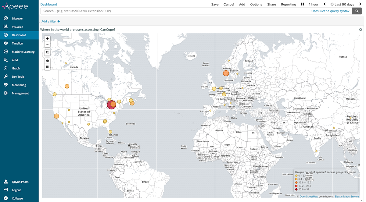 As a participant in the iCanCope pilot RCT, young people aged 12 to 25 years with chronic pain were instructed to download the app onto their personal device, create an account, and use the app as needed over the 8-week study period. Given that participants were free to engage with the app wherever they wanted, they subsequently generated an internet protocol (IP) address trail that we were able to access through analyzing their device log data. The opportunity to determine and map the physical location of a user’s IP address in real time was a novel challenge for our research group and a feature we wanted to trial in APEEE. We used Logstash’s GeoIP database to convert IP addresses into latitude and longitude coordinate pairs, which were then stored in Elasticsearch as geo_point fields and converted into geohash strings. Kibana was then used to read the geohash strings and draw them as points on a global map.