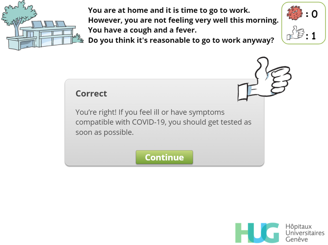 To keep track of the player’s choices and to strengthen IPC messages, a virus counter was created. Whenever the player selects an answer that can lead to a possible contamination, a red virus image appears, and the virus count rises incrementally. Conversely, every time the player selects an answer that matches a desirable behavior, a positive token in the form of a “thumbs-up” image is awarded. If the player reaches a total of 5 viruses, a “game over” screen () appears. The user can then choose to decrease the virus count by exchanging “thumbs-up” tokens against viruses or to restart the level. We decided that the players should only restart the level, and not the entire game, in order to provide a more positive feedback and to avoid generating frustration. Moreover, a positive message is displayed at the end of each of the 4 levels. These messages are designed to strengthen the player’s motivation to comply with IPC guidelines and are not influenced by the virus count.