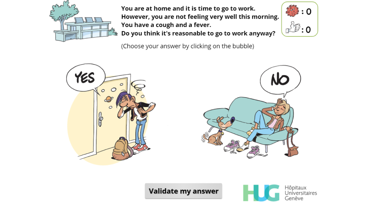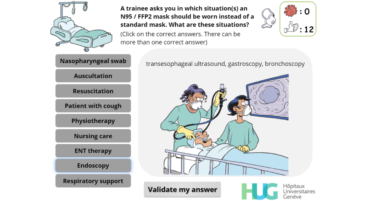 Early on in the development process, developers and IPC specialists agreed that the target audience should be composed of all the professionals who could be in direct contact with patients within the Geneva University Hospitals. The game was therefore designed to target many different kinds of health care professionals including physicians, nurses, physiotherapists, assistants, technicians, and therapists but also non–health care professionals. Indeed, some of these employees have close and regular contact with patients (stretcher-bearers, housekeepers, etc) and might therefore be exposed to patients or play a role in SARS-CoV-2 transmission.