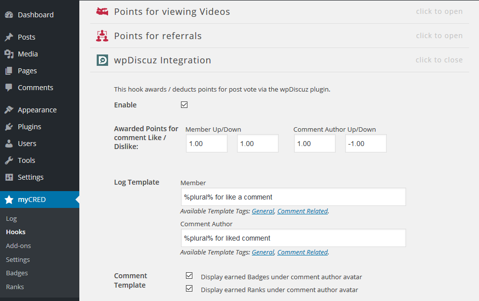 1. It’s integrated with myCRED hooks, it adds a new option to +/- user points based on wpDiscuz comment likes/dislikes. This «Like to Point» feature also works for voters, they can get certain amount of points for comment voting. You can manage points for comment author and for comment voters in myCRED hook setting page.