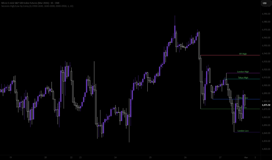 Asian Session Boxes: Highlights the initial daily range (18:00–00:00 EST) using transparent blue boxes (#4B6EEC) to identify liquidity zones.