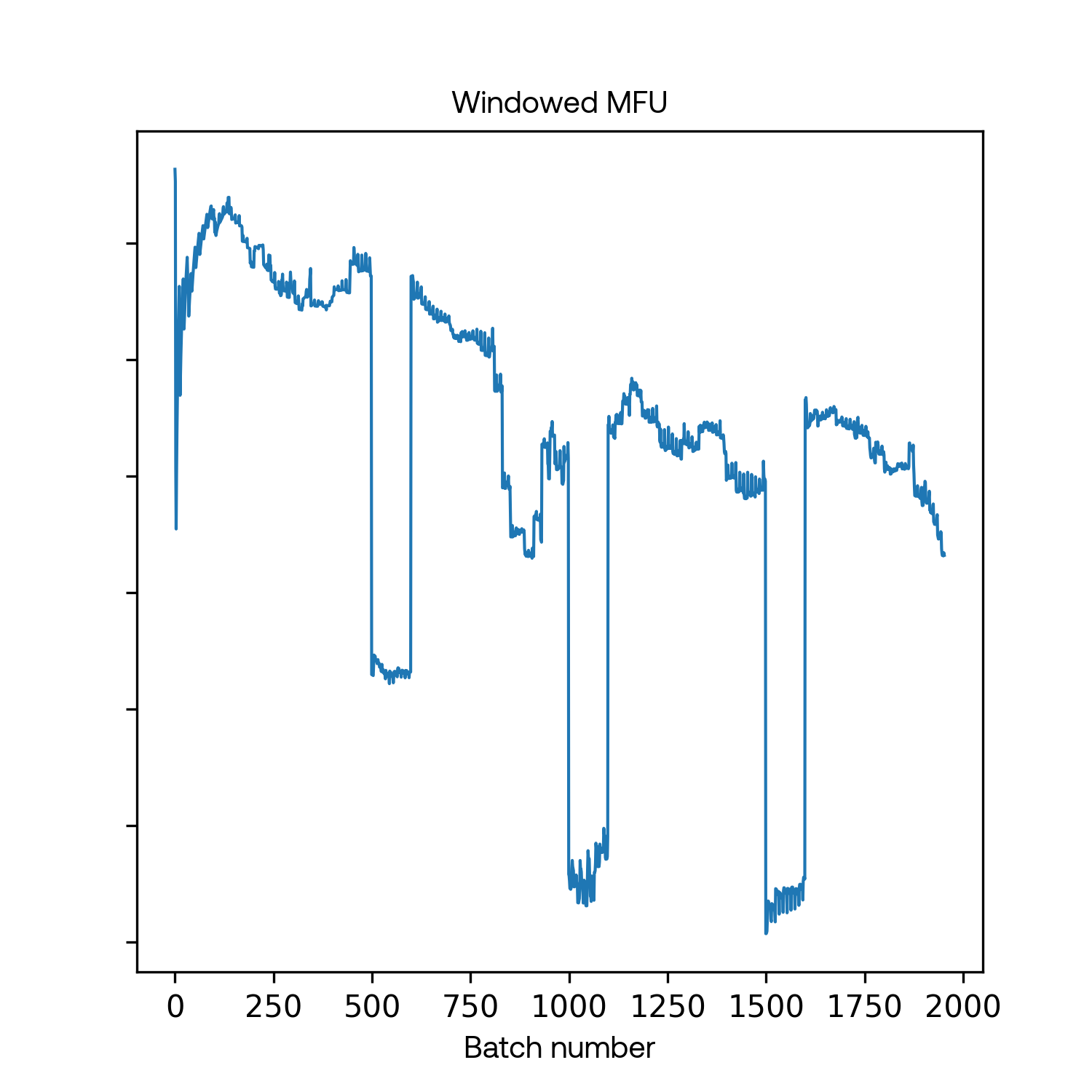 We also found it useful to measure instantaneous (i.e. per-batch) MFU rather than a smoothed or windowed average, as the pre-smoothed shape of the MFU curve often helped us diagnose the class of issue. Issues included: