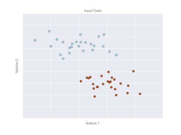 There are a number of possible models for such a classification task, but here we will use an extremely simple one. We will make the assumption that the two groups can be separated by drawing a straight line through the plane between them, such that points on each side of the line fall in the same group. Here the model is a quantitative version of the statement "a straight line separates the classes", while the model parameters are the particular numbers describing the location and orientation of that line for our data. The optimal values for these model parameters are learned from the data (this is the "learning" in machine learning), which is often called training the model.