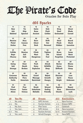 The Events tables (the d6 table of the Pirate’s Code and the d66 table of Events to Die For) are both in there for when the player just needs a little inspiration, or they just want to shake things up. You could also use them if you need more ideas for your Maritime Travel Encounters (when you Fail the Presence tests). Honestly, the keywords Event and Encounter could pretty much be interchangeable.