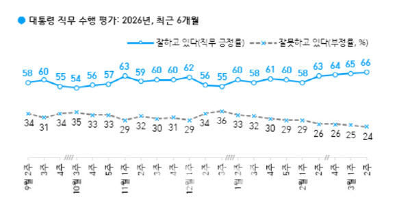 정당호감도 조사에선 혁신당이 野 최선두[이데일리 김유성 기자] 이재명 대통령의 지지율이 전주 대비 1%포인트 오른 66%를 기록했다. 지난 6월 현 정부 출범 후 최고치다. 직무 부정률은 24%였다. 현 정부 출범 후 최저 기록은 21%다.