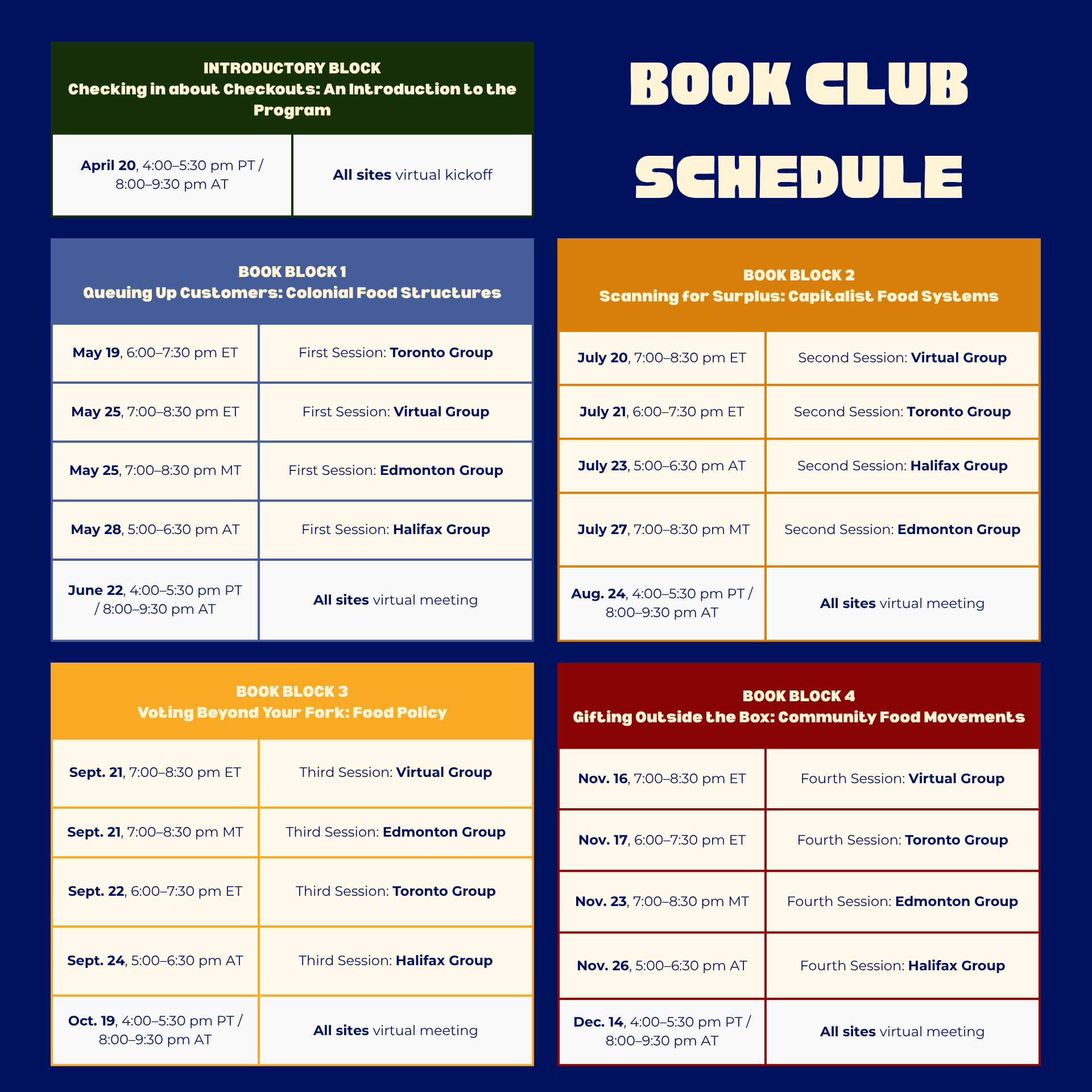 The Edmonton group will meet at Magpie Books; the Toronto group will meet at East End Food Hub; the Halifax group will meet at Trident Cafe; and the virtual group will meet on Zoom. Light refreshments will be provided for the in-person groups!