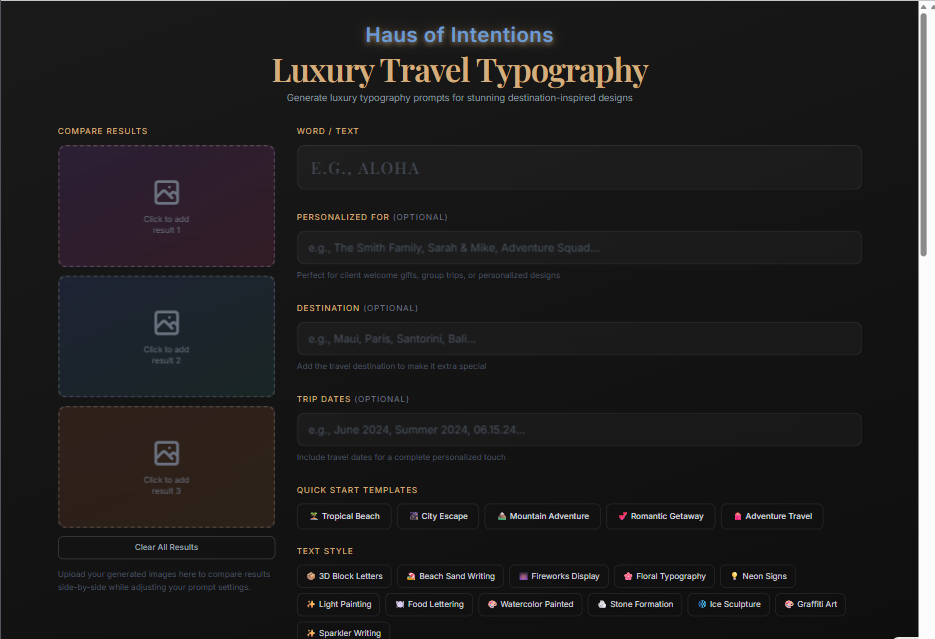 This is a private, interactive prompt generator that creates luxury travel typography prompts for use with Canva AI and image generators.