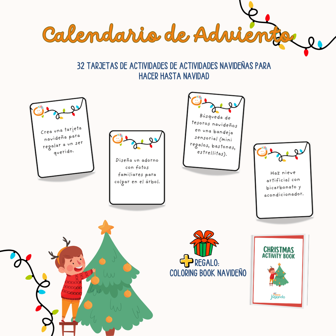 - Tarjetas con actividades navideñas para hacer cada día (manualidades, juegos, cocina, actividades sensoriales y momentos en familia).