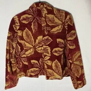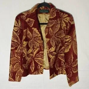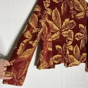 Harvé Benard Red Yellow Chenille Leaf Print Tapestry Open Front Blazer Jacket S