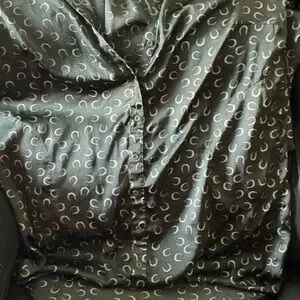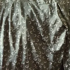 Olive green blouse featuring an allover horseshoe print. Soft drape fabric. Casual versatile top for everyday wear.