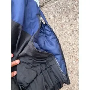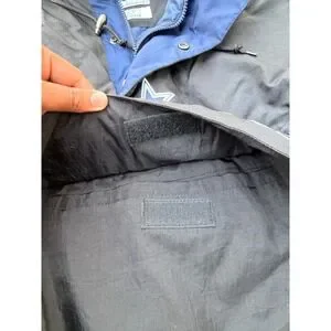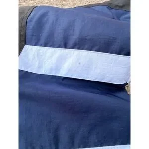Pre-owned vintage condition. Shows normal wear consistent with age. Minor discoloration visible on one light blue sleeve stripe (see photos). No rips or major structural damage noted. Zipper and snaps function properly.