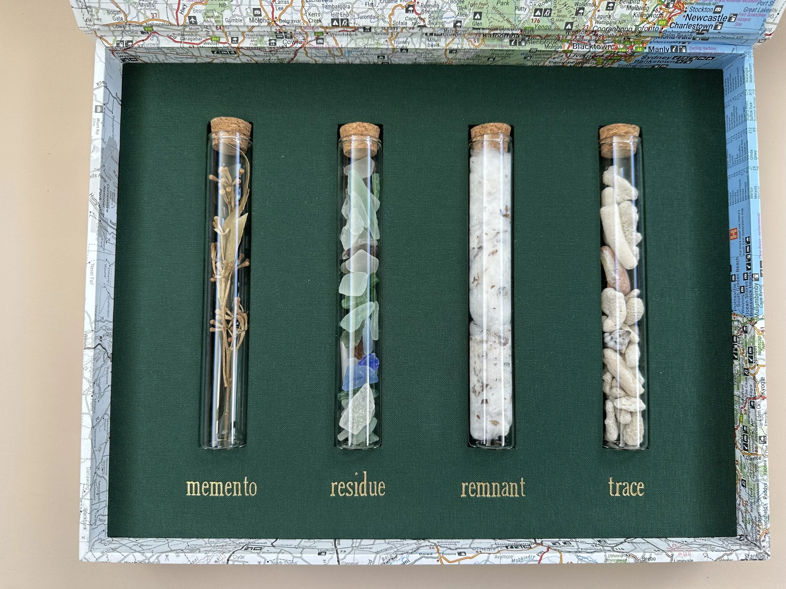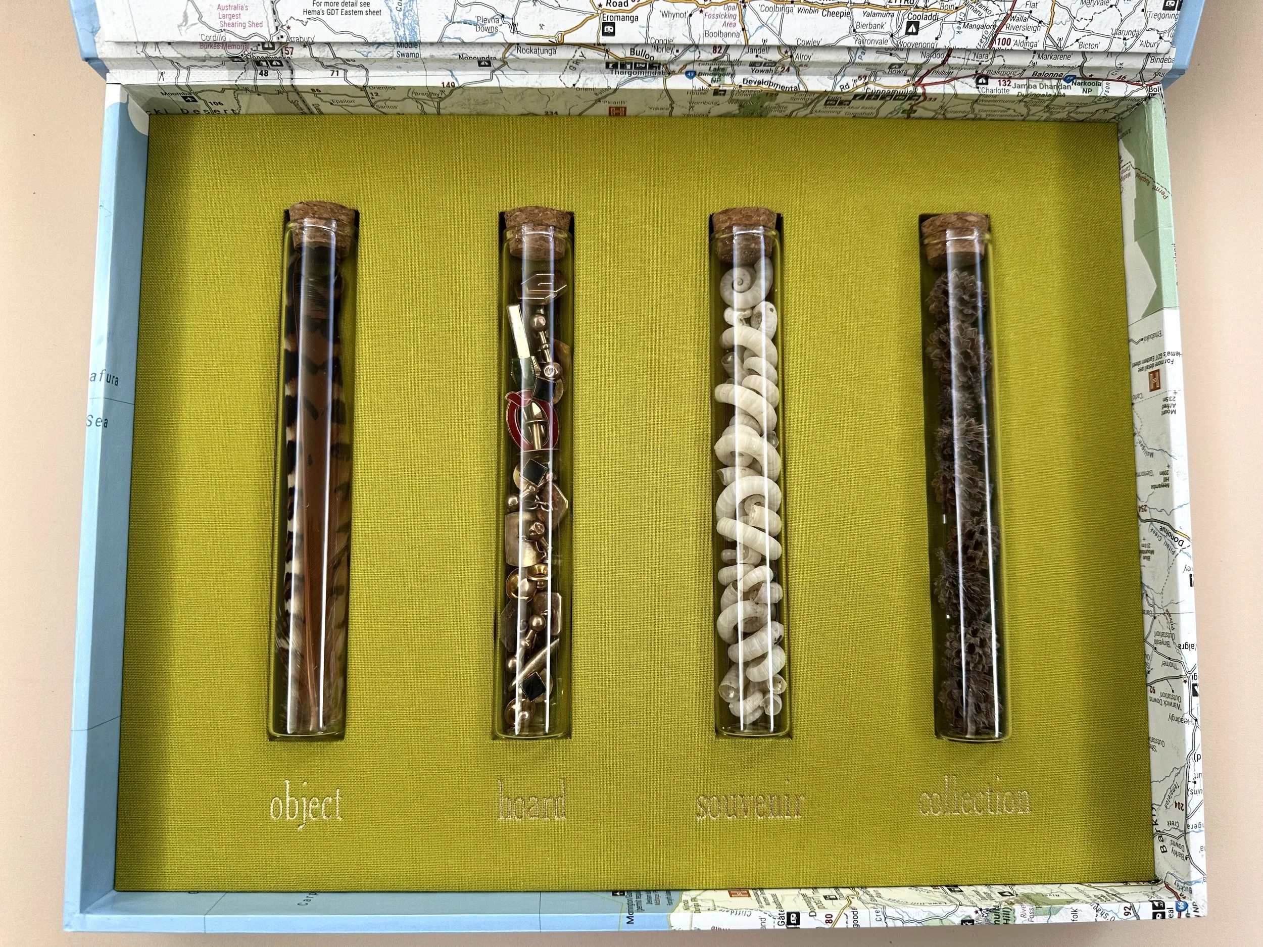 Archival solander boxes, lined with maps of Australia, designed by the artist constructed by Keep Collect, United Kingdom.