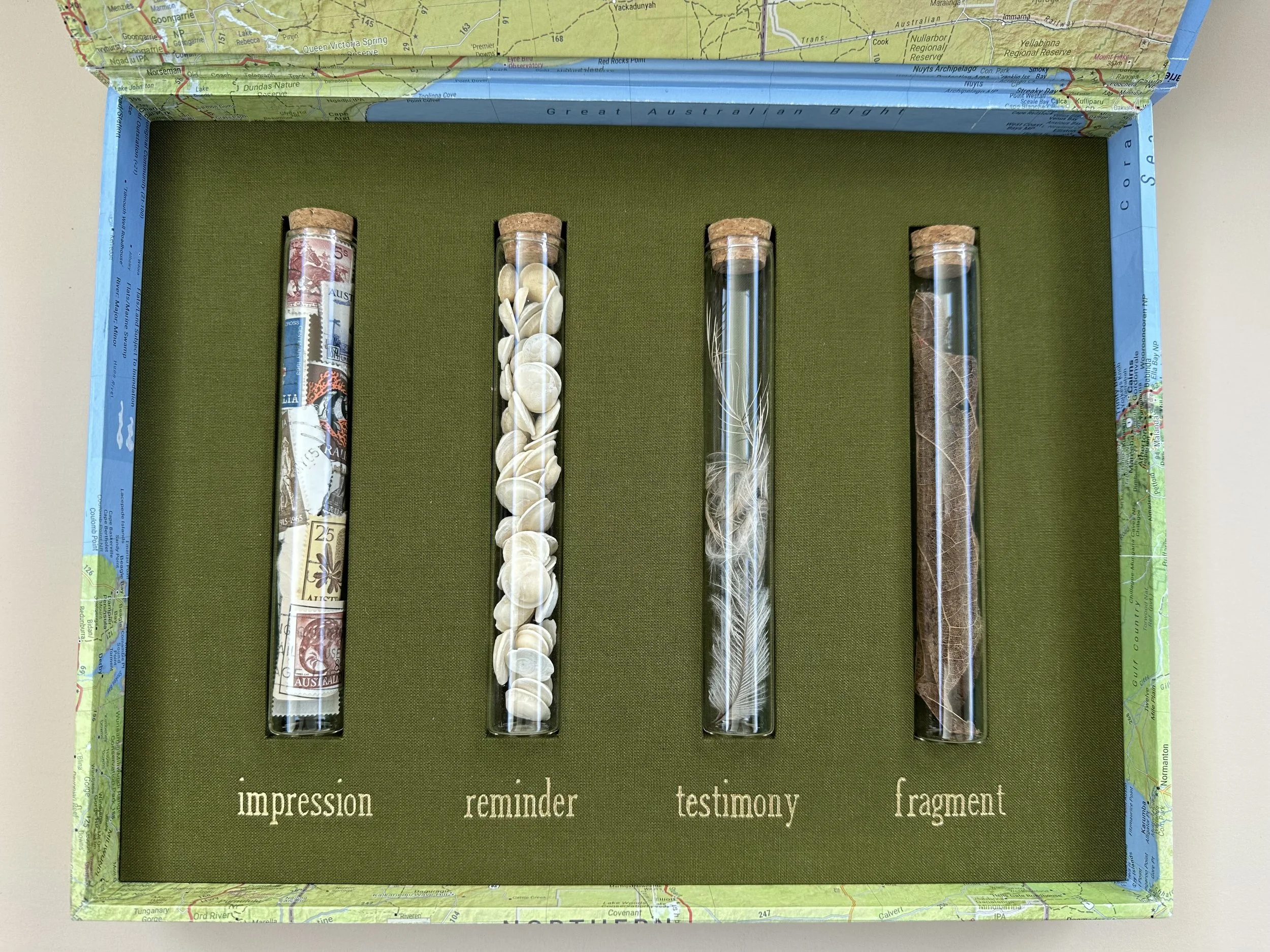 Each fragment is a trace: gum leaf, feather, pod, glass, plate, coral—objects gathered like bark, rings, seeds.
