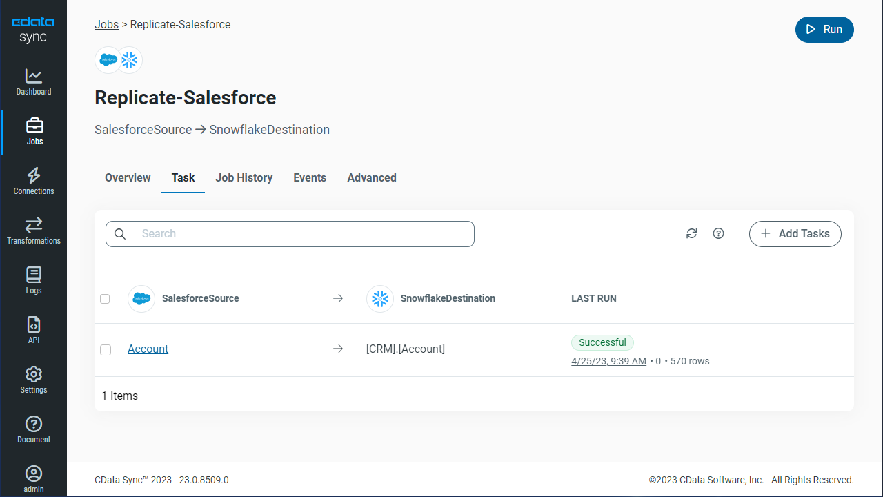 CData Sync enables you to control replication with a point-and-click interface and with SQL queries. For each replication you wish to configure, navigate to the Jobs tab and click Add Job. Select the Source and Destination for your replication.