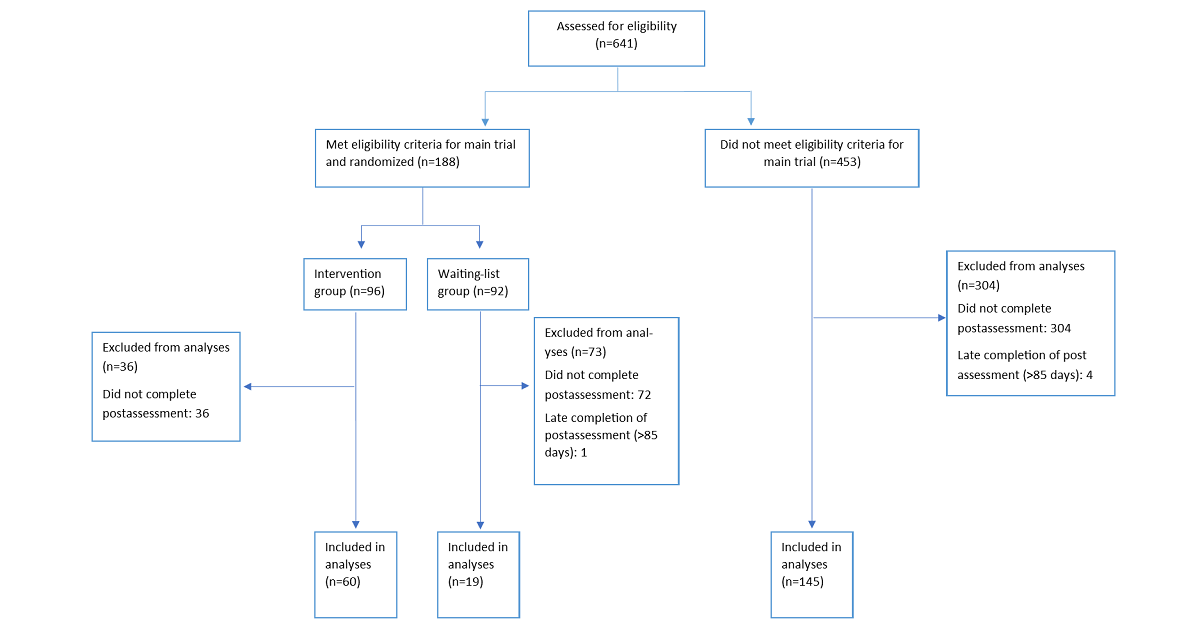 Of the 641 participants who showed interest in the study and provided consent, a total of 224 participants provided postintervention outcome data within a period of 85 days. illustrates the number of participants coming from each of the branches of the main trial. The number of participants included in this study that were excluded from the main RCT, and the reasons are as follows (participants can respond to more than one reason):