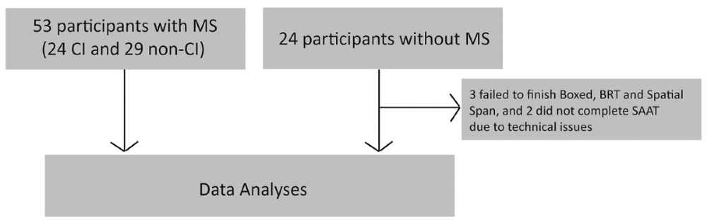 A total of 53 participants with MS (mean age 51.8 [1.7] years) and 24 participants without MS (mean age 46.0 [3.7] years) completed the assessments; their demographic and clinical characteristics are summarized in . One-way ANOVA revealed no age differences between the groups (F(2,76)=1.42, P=.24). For categorical variables (ie, sex and race), chi-square tests showed no statistically significant association between groups and sex (X2(2)=5.31, P=.07) as well as race (X2(4)=2.90, P=.59). For analysis purposes, the 53 participants with MS were divided into CI (n=24 [45%]) and non-CI (n=29 [55%]) subgroups based on to their baseline SDMT z score. details the task completion rate.
