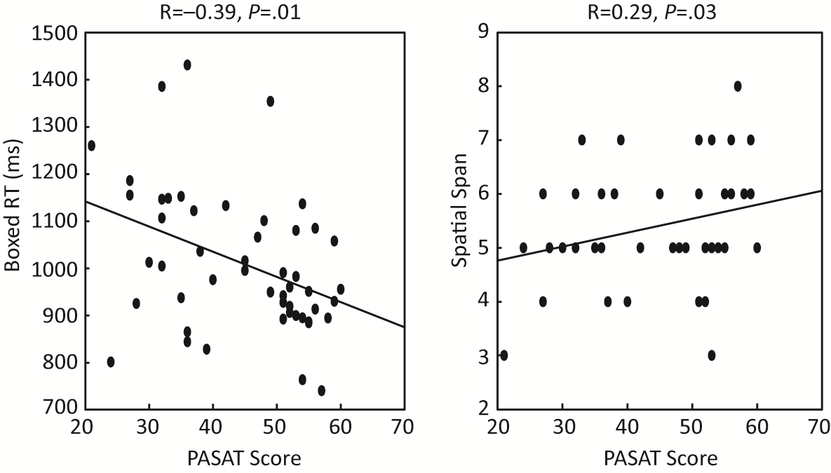 When controlling for age, sex, years of education, and the BRT with partial correlations, similar results were observed (Boxed RT: R=–0.44, P<.001; Boxed distraction cost: R=–0.28, P=.01; SAAT RT: R=–0.17, P=.15; Spatial Span: R=0.18, P=.12; ). When we restricted the analyses to only participants with MS, SDMT correlations with the Boxed RT and Boxed distraction cost remained statistically significant (Boxed RT: R=–0.50, P<.001; Boxed distraction cost: R=–0.34, P=.01; SAAT RT: R=–0.22, P=.10; Spatial Span: R=0.24, P=.07). Again, in adjusted correlation analyses, we saw similar results (Boxed RT: R=–0.43, P=.002; Boxed distraction cost: R=–0.38, P=.01; SAAT RT: R=–0.16, P=.26; Spatial Span: R=0.18, P=.21; ).