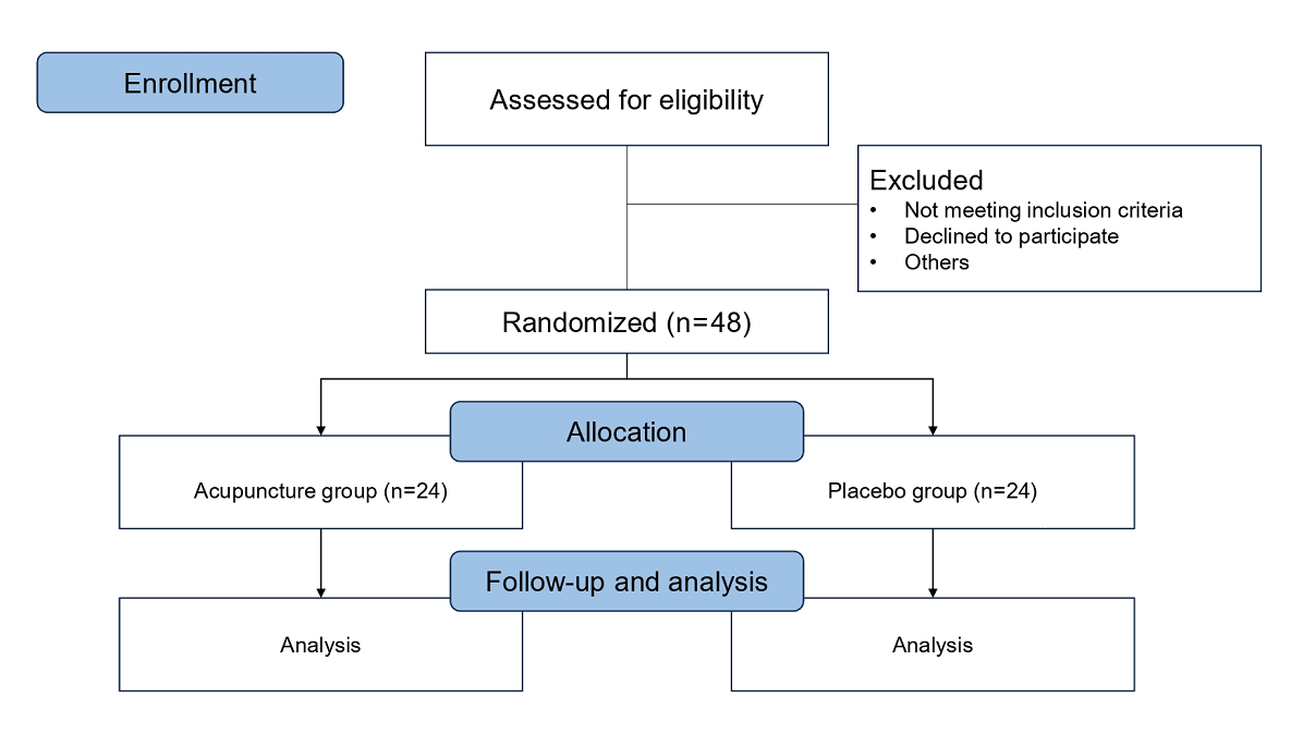 Eligible participants who sign the informed consent form will be randomly assigned to the acupuncture or placebo group in a 1:1 ratio. Random sequences will be generated by permuted block randomization of block size 2 or 4 using the random allocation tool in R software 4.1 (R Foundation for Statistical Computing). Random sequence generation will be performed, and random sequences will be determined by an independent statistician prior to enrollment. Only the statistician who generates the random sequence will be aware of the full randomization sequence.
