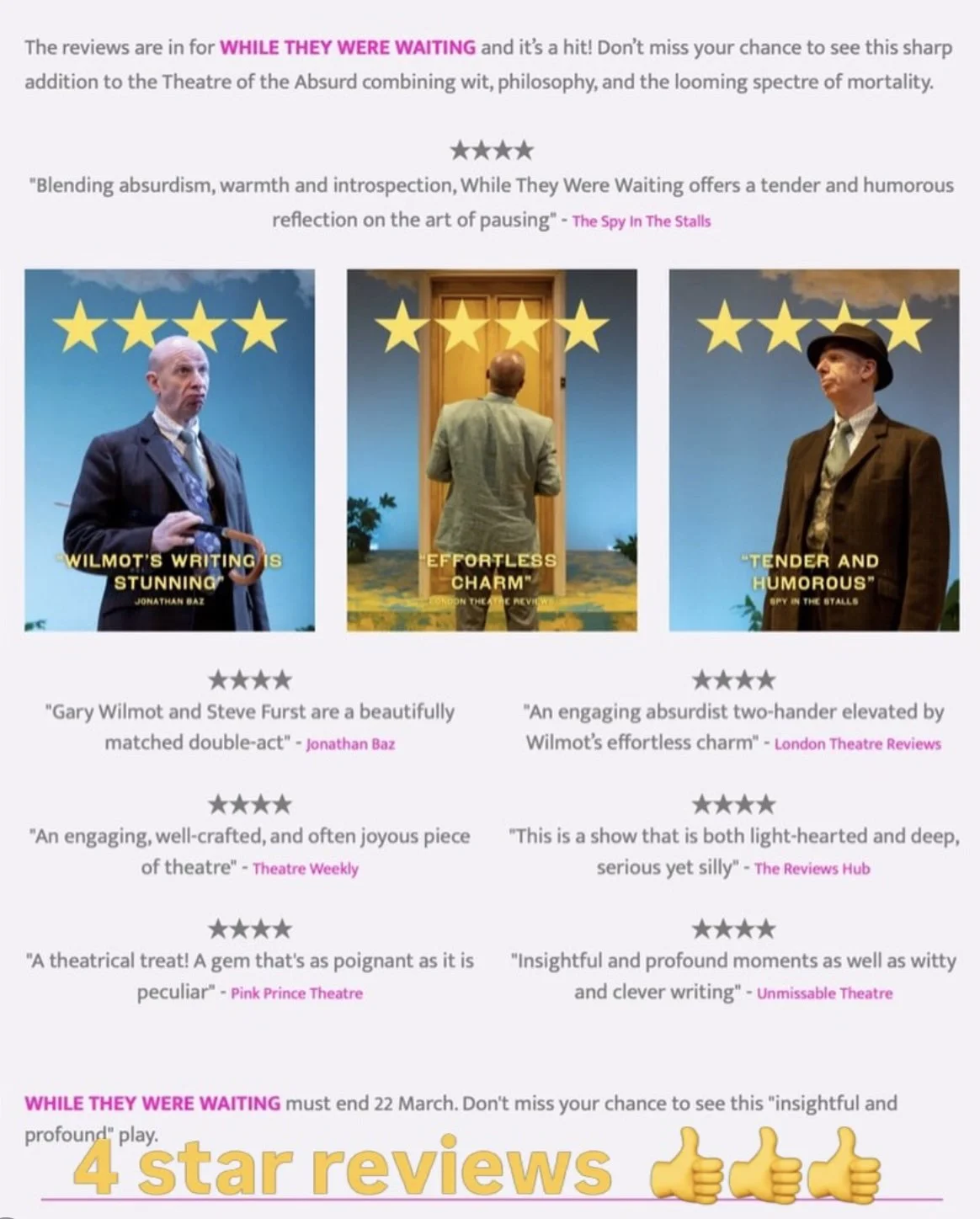 Back in 2019 Gary Wilmot and I appeared together in the very excellent ‘Mr Gum and The Dancing Bear’ at the National Theatre. During the protracted tech period (where there is always an enormous amount of sitting around) we were sharing a dressing room and Gary had the idea of writing a play about waiting.